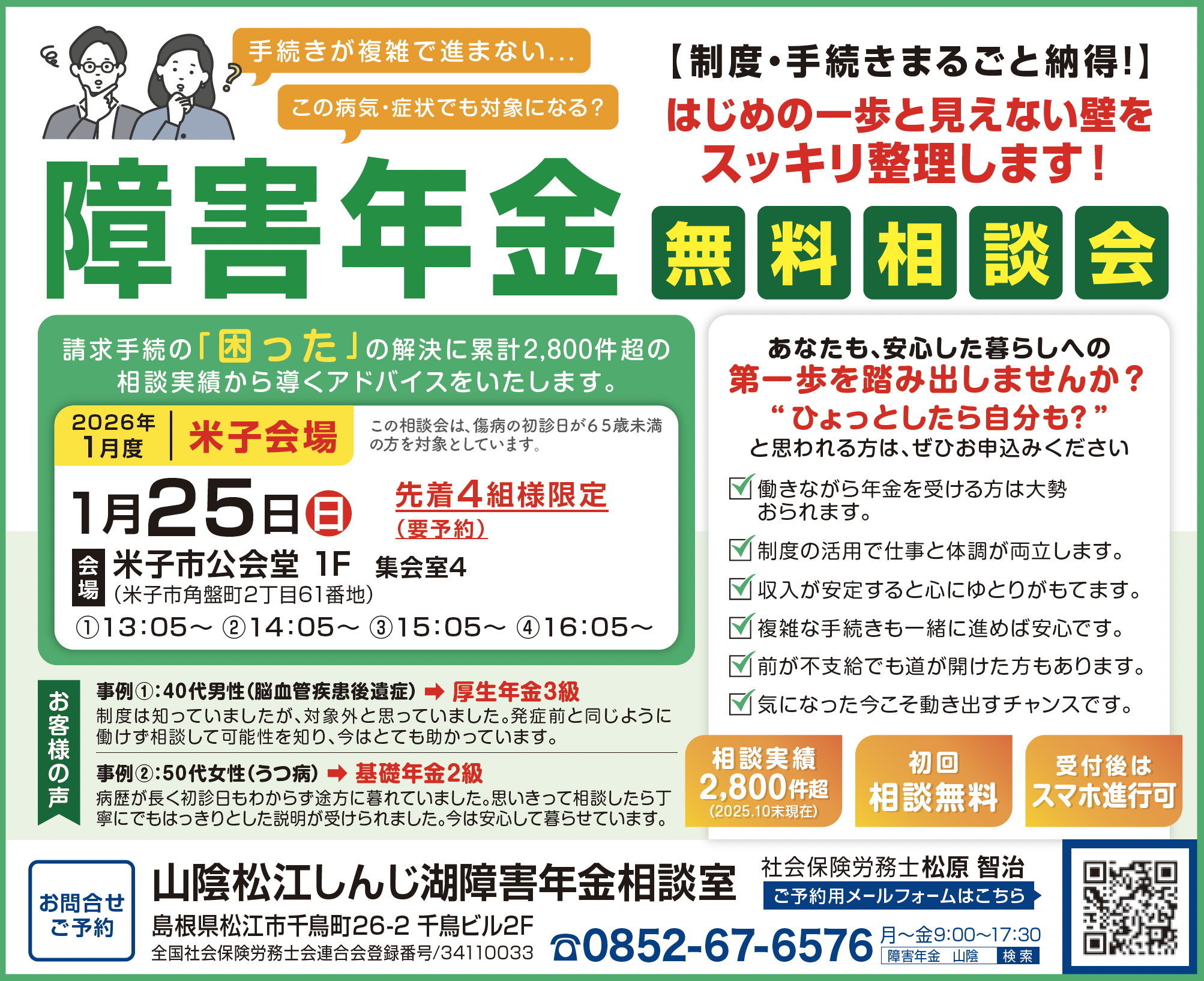 山陰で長年実務に携わる障害年金専門の社会保険労務士が、あなたの状況に合わせて “いつから?いくら?どうやって?” をわかりやすくお示しします。